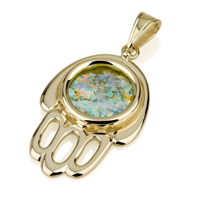 Good fortune will come to the wearer of this charming Hamsa pendant. The ancient Mideast amulet in the shape of an open hand. The rainbow-colored glass that has been recovered from archeological digs in the Holy Land somehow lends a modern sparkle to this ancient symbol. Certificate of Authenticity available.