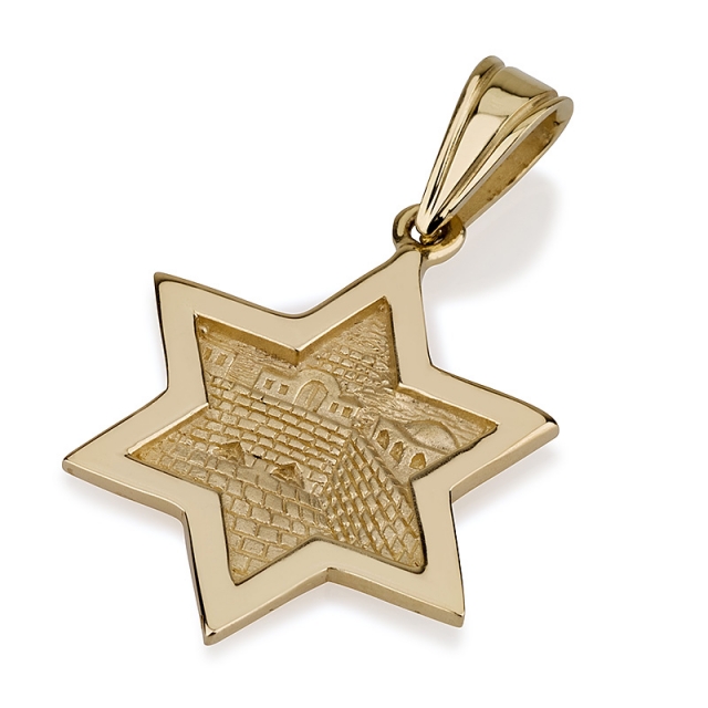 14K Gold Star of David Pendant with Old Jerusalem Motif